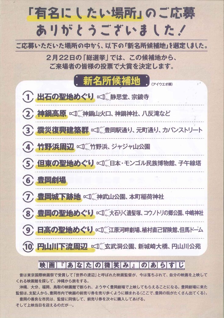 2月22日(日)に豊岡劇場にて行われる「総選挙」では、この候補地の中からご来場者の皆様の投票で大賞を決定します。